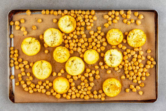 Den Backofen auf 220°C (200°C Umluft) vorheizen. Die Kichererbsen in einem Sieb mit kaltem Wasser abspülen und abtropfen lassen. Die Zucchini in 1–2cm dicke Scheiben schneiden.