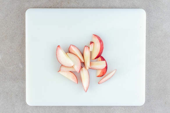Die Nektarinen halbieren und entsteinen, dann das Fruchtfleisch in 1–2cm breite Spalten schneiden.