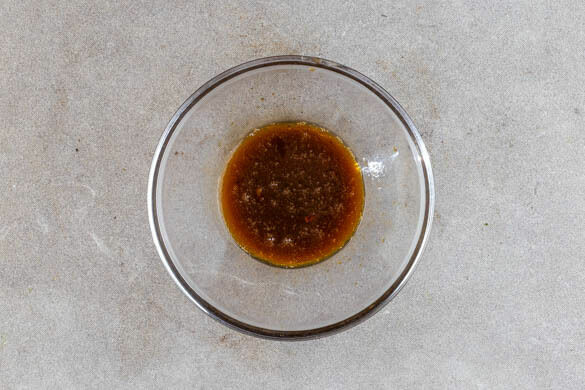 2EL Olivenöl, 4EL Balsamicoessig, 2EL Wasser, ½TL Salz und 1 kräftige Prise Pfeffer zu einem Dressing verrühren. Den ausgetretenen Fleischsaft aus der Pfanne unterrühren.