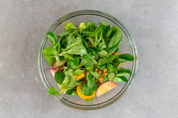 Die Kichererbsen, die Zucchini und die Nektarinen mit ¾ des Dressings vermengen, den Feldsalat unterheben. Das Fleisch nach Belieben in Tranchen schneiden, auf dem Salat anrichten und mit dem restlichen Dressing beträufelt servieren.