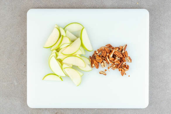 Die Äpfel ggf. schälen, vierteln, entkernen und in ca. 0,5m dünne Scheiben schneiden. Die Pekannusskerne grob hacken.