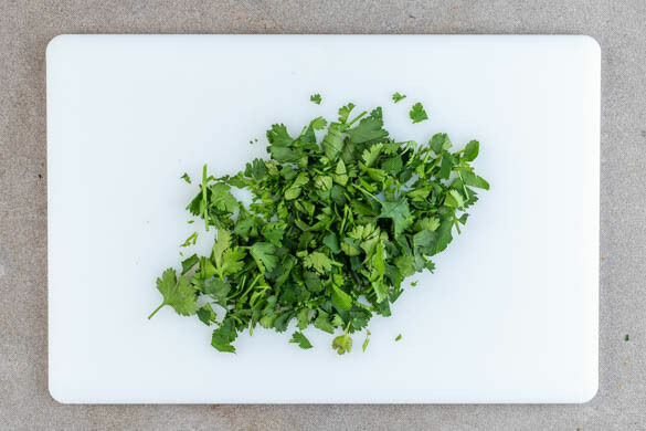 Den Koriander grob schneiden. Das Curry mit Salz und Pfeffer abschmecken, auf dem Reis anrichten und mit den Cashews und dem Koriander garniert servieren.