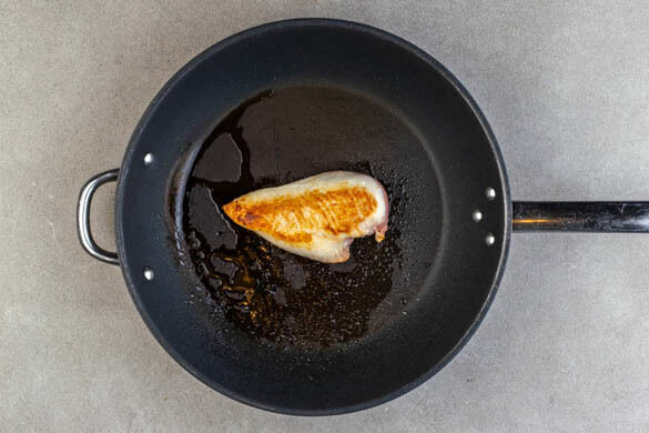 In einem großen Topf ausreichend gesalzenes Wasser für die Pasta zum Kochen bringen. Das Fleisch trocken tupfen, mit 2 kräftigen Prisen Salz würzen und in einer großen Pfanne mit 2EL Olivenöl bei starker Hitze auf jeder Seite ca. 3Min. goldbraun anbraten. Das Fleisch aus der Pfanne nehmen und abgedeckt auf einem Teller ruhen lassen, die Pfanne wird weiterverwendet.