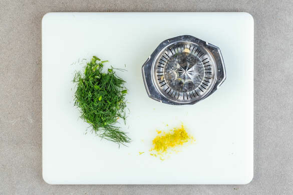 Den Dill samt Stängeln fein schneiden. 2TL Zitronenschale abreiben, dann die Zitrone halbieren und auspressen.