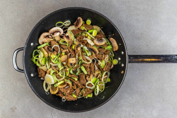 Die Pilze, den Lauch und das Gulasch mit ½TL Salz in einer großen Pfanne mit 2EL Olivenöl bei mittlerer bis starker Hitze unter gelegentlichem Rühren 5–7 Min. braten, bis die Pilze und der Lauch weich sind und das Gulasch gut durchgewärmt ist.
