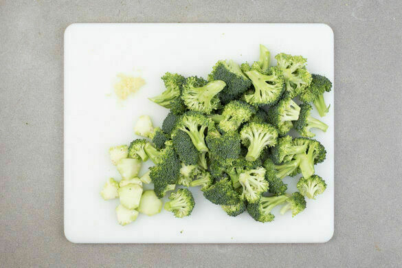 Den Brokkoli in mundgerechte Röschen schneiden, den Strunk ggf. schälen und in dünne Scheiben schneiden. Den Knoblauch schälen und fein würfeln.