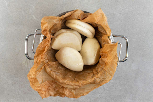 Ein ausreichend großes Stück Backpapier zerknüllen, wieder auffalten und in den Dampfkorb legen. Die Hefebrötchen hineingeben und ca. 7Min. abgedeckt dämpfen, bis sie erhitzt und weich sind. Vorsicht, heißer Dampf! Tipp: Die Hefebrötchen mit einem sauberen Küchentuch abdecken, damit sie warm und feucht bleiben.