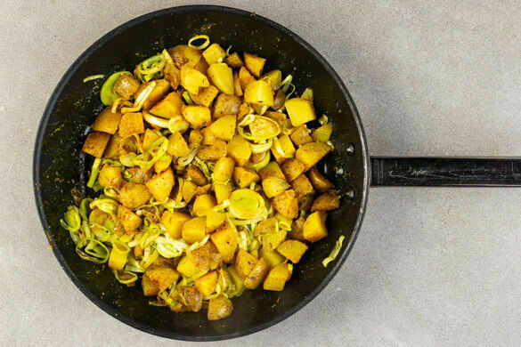 Die Kartoffeln dazugeben und 6–8Min. mitbraten. Das Currypulver während der letzten Minute zugeben und mitbraten.