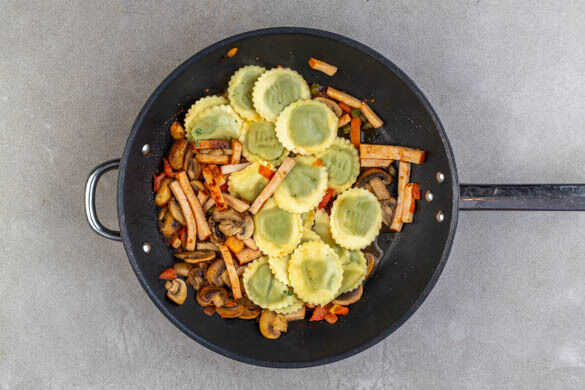 Die geräucherten Hähnchenstreifen und die Tomaten zu den Pilzen in die Pfanne geben und 3–4Min. mitbraten.