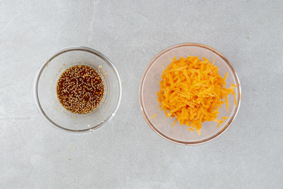 Die Karotten ggf. schälen und mit einer Küchenreibe grob raspeln. Den Knoblauch schälen und fein würfeln. ½TL Knoblauch mit 2EL Sojasauce, 4EL Essig, 1TL Sriracha-Sauce, 1EL gerösteten Sesamöl und 1 Prise Salz zu einem Dressing verrühren und mit den Karotten vermengen. Tipp: Wer es schärfer mag, kann mehr Sriracha-Sauce verwenden.