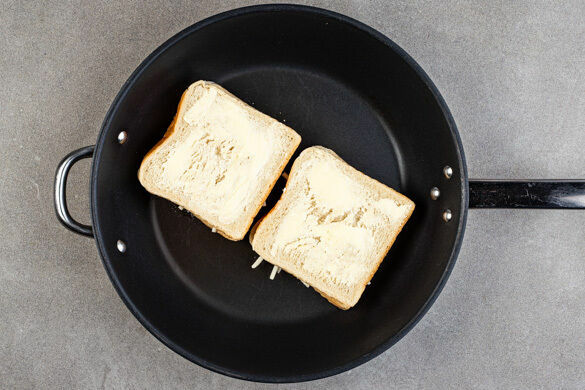 Die Toastscheiben auf einer Seite mit insgesamt 2EL Margarine bestreichen. 2 Scheiben umdrehen und mit dem Käse bestreuen. Die übrigen Toastscheiben mit der bestrichenen Seite nach oben darauf legen. Die Toasts in einer großen Pfanne bei mittlerer Hitze auf jeder Seite in 2–3Min. goldbraun braten.