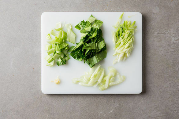 Den Pak Choi in 1–2cm breite Streifen schneiden, dabei die weißen und grünen Teile voneinander trennen und beiseitelegen. Die Lauchzwiebel schräg in feine Streifen schneiden. Den Stangensellerie in ca. 0,5cm dünne, schräge Streifen schneiden.