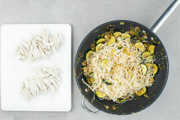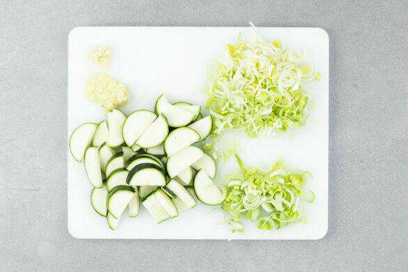In einem kleinen Topf 400ml gesalzenes Wasser zum Kochen bringen. Den Ingwer und den Knoblauch schälen und sehr fein würfeln oder reiben. Die Zucchini längs halbieren und in ca. 1cm dicke Scheiben schneiden. Den Lauch längs halbieren und in dünne Streifen schneiden, 1 Handvoll Lauch für die Sauce getrennt beiseitelegen.