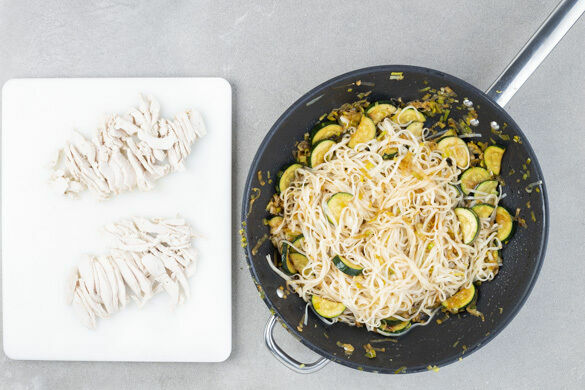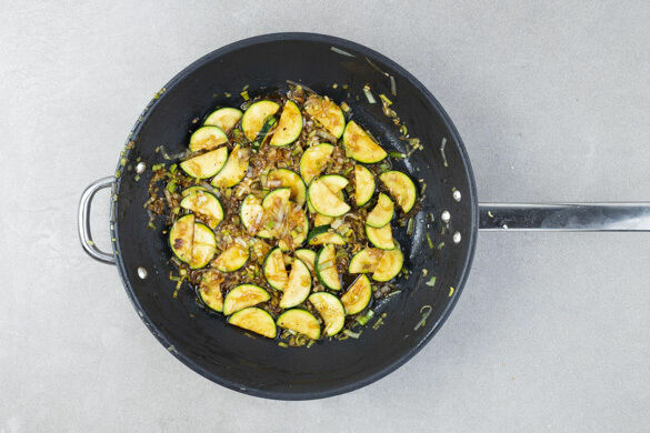 Den Lauch und die Zucchini in einer großen Pfanne mit 1EL Pflanzenöl und 1 Prise Salz bei starker Hitze ca. 4Min. anbraten. Die Sriracha-Sauce mit der Sojasauce, dem Knoblauch und 1/2TL Zucker verrühren, mit dem Gemüse in der Pfanne vermengen und das Gemüse noch 1–2Min. weitergaren.