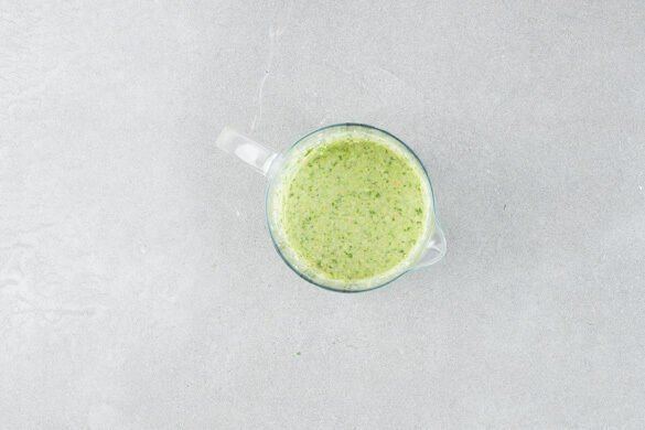 Den Koriander samt Stängeln grob schneiden und mit dem Lauch für die Sauce, dem restlichen Ingwer, der 1/2 der Erdnüsse, 1EL Pflanzenöl, 1EL Essig, 4EL Wasser und 2 Prisen Salz in einem hohen Gefäß mit einem Stabmixer glatt pürieren.