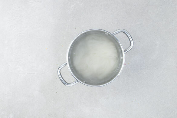 In einem mittelgroßen Topf ausreichend gesalzenes Wasser für die Nudeln zum Kochen bringen. Die Nudeln in das kochende Wasser geben und gut umrühren. Den Topf vom Herd nehmen und die Nudeln ohne Hitzezufuhr ca. 8Min. ziehen lassen. In ein Sieb abgießen und kalt abschrecken.