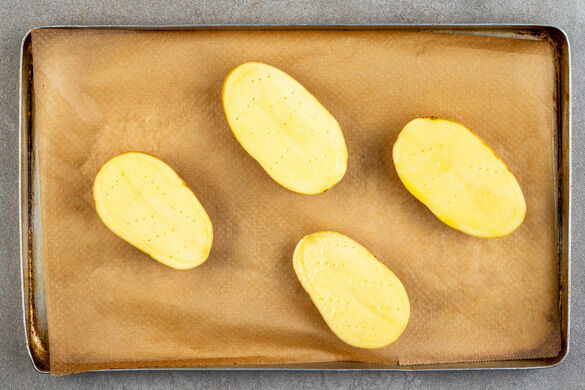 Die Kartoffeln mit den Schnittseiten nach oben auf einem mit Backpapier ausgelegten Backblech verteilen und 30–35Min. im Ofen backen, bis sie gar sind.