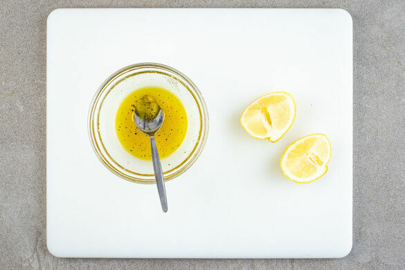 Die Zitrone halbieren, dann eine Hälfte auspressen und die andere Hälfte in 2 Spalten schneiden. Den Zitronensaft mit 1EL Olivenöl und 2TL Honig zu einem Dressing verrühren. Mit Salz und Pfeffer abschmecken.
