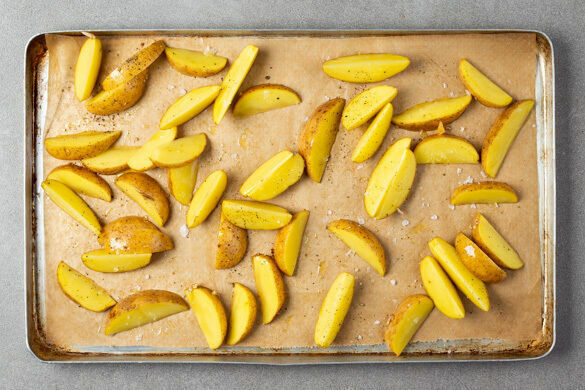 Den Backofen auf 240°C (220°C Umluft) vorheizen. Die Kartoffeln in ca. 1cm breite Spalten schneiden, mit 2EL Olivenöl und je 2 kräftigen Prisen Salz und Pfeffer vermengen. Auf einem mit Backpapier ausgelegten Backblech verteilen und 20–25Min. im Ofen backen.