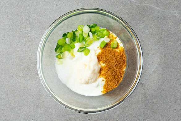 Den Joghurt mit 4EL Mayonnaise und ca. ⅔ des Currypulvers verrühren, dann die Lauchzwiebeln unterheben und den Dip mit Salz und Pfeffer abschmecken. Das Fleisch trocken tupfen und jeweils horizontal in 2 Schnitzel schneiden.