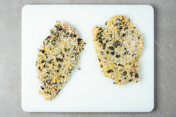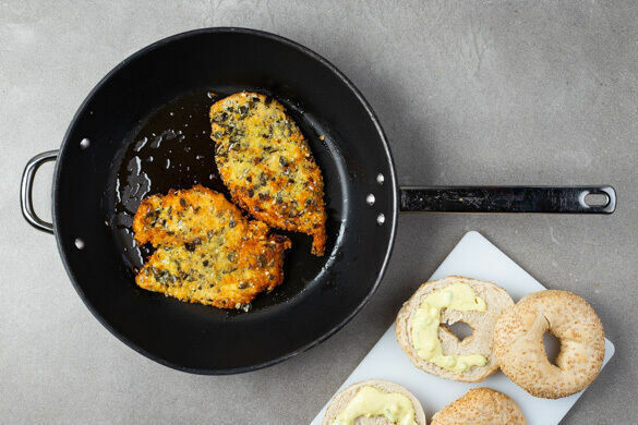 Die Schnitzel in einer großen Pfanne mit 4EL Olivenöl bei mittlerer Hitze auf jeder Seite 3–4Min. braten, bis die Panade goldgelb und knusprig und das Fleisch durch ist. Währenddessen die Bagels 4–5Min. im Ofen aufbacken.