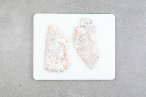 Das Fleisch trocken tupfen und horizontal in 2 dünne Schnitzel schneiden. Mit einem Fleischklopfer oder dem Boden einer schweren Pfanne zwischen zwei Lagen Frischhaltefolie oder Backpapier flach klopfen und die Schnitzel mit je 1 Prise Salz und Pfeffer würzen. Anschließend in 2EL Mehl wenden, bis sie rundum gleichmäßig mit Mehl bedeckt sind.