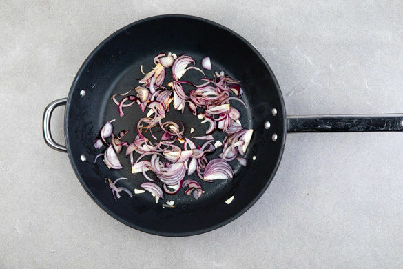 Die Zwiebeln und den Knoblauch in einer mittelgroßen Pfanne mit 1EL Olivenöl bei mittlerer Hitze 2–3Min. glasig anschwitzen, dann aus der Pfanne nehmen. Die Pfanne aufbewahren.