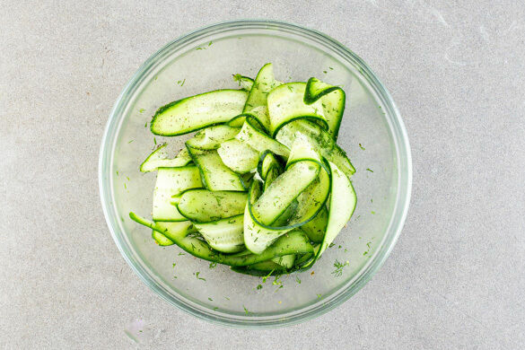 Inzwischen die Dillspitzen von den Stängeln zupfen und grob schneiden. Die Gurke mit einem Sparschäler in breite Streifen schneiden und mit den Dillspitzen, 1EL Essig, 1 kräftigen Prise Zucker und je 1 Prise Salz und Pfeffer vermengen.