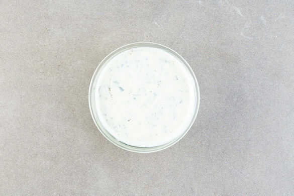 Die ½ des Knoblauchs, die Minze und 1 kräftige Prise Salz mit dem Joghurt verrühren. Bis zum Servieren kalt stellen.