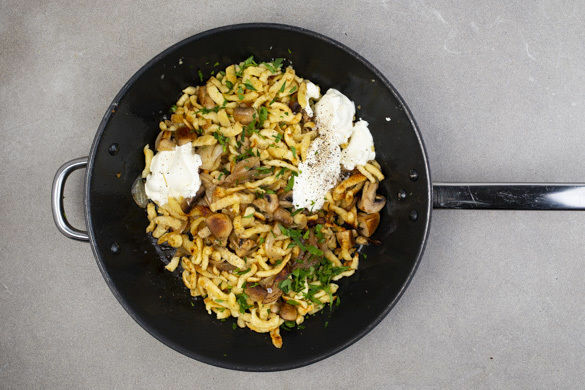 Wenn die Pilze gut angebraten sind, die Spätzle mit in die Pfanne geben und 3–4Min. braten, bis sie goldbraun sind. Dann die Crème fraîche und ¾ der Petersilie untermischen und mit Salz und Pfeffer würzen.