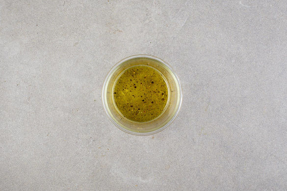 Aus 1EL Pflanzenöl, 1EL Essig sowie je 1 kräftigen Prise Salz, Pfeffer und Zucker ein Dressing anrühren. Kurz vor dem Servieren mit dem Salat vermengen.