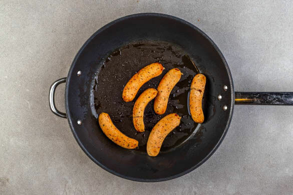 Die Würste längs halbieren und in einer großen Pfanne mit 1EL Olivenöl bei mittlerer Hitze 5–6Min. braten, bis sie durchgewärmt und appetitlich gebräunt sind. Aus der Pfanne nehmen und abgedeckt beiseitestellen, die Pfanne wird weiterverwendet.