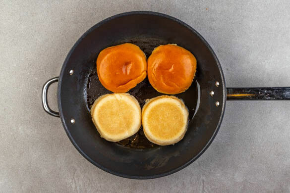 Die Brötchen aufschneiden und in der Pfanne mit der Schnittseite nach unten bei mittlerer Hitze 1–2Min. anrösten.