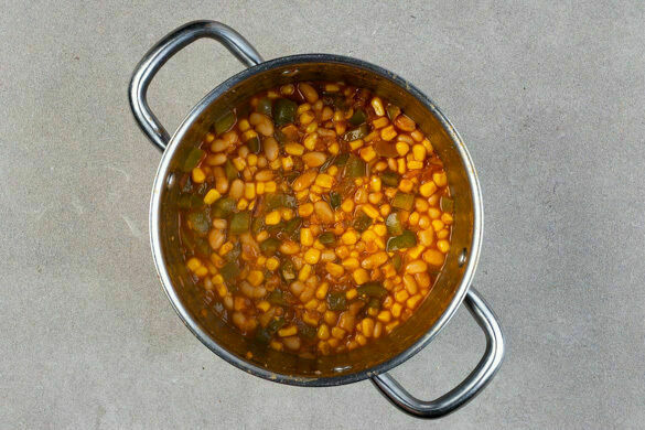 Die Bohnen und den Mais in einem Sieb mit kaltem Wasser abspülen und abtropfen lassen, dann mit in den Topf geben. 500ml heißes Wasser angießen und 1TL Salz einrühren. Das Chili bei starker Hitze zum Kochen bringen, dann bei mittlerer Hitze ca. 15Min. köcheln lassen. Ggf. mehr Wasser zugeben, falls das Chili zu dickflüssig ist.