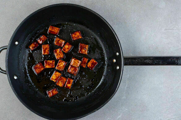 Den Tofu mit möglichst wenig Würzsauce in einer großen Pfanne mit 2EL Pflanzenöl bei mittlerer Hitze 3–5Min. goldbraun anbraten. Dann die restliche Würzsauce dazugeben, kurz erwärmen und den Tofu gut in der Sauce wenden. Den Glasnudelsalat auf Teller verteilen, den Tofu darauf anrichten und mit dem restlichen Koriander garniert servieren.