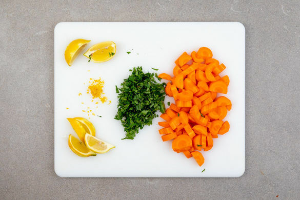 Die Karotte ggf. schälen, längs halbieren und in ca. 0,5cm breite Scheiben schneiden. Die Petersilie samt Stängeln grob hacken. Die Zitronenschale abreiben, dann die Zitrone in Spalten schneiden. In einem kleinen Topf 300ml Wasser mit der ½ des Brühgewürzes zum Kochen bringen.