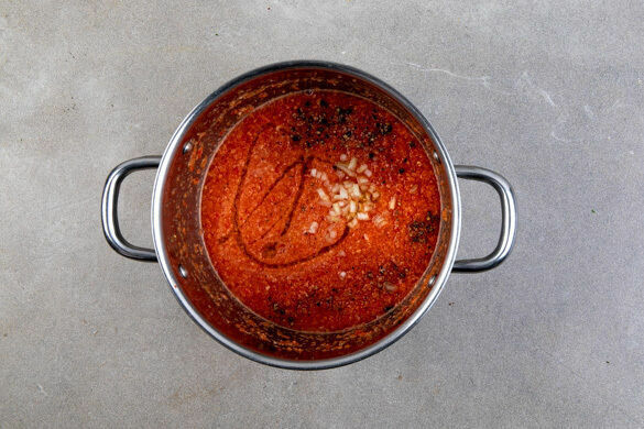 Die Gazpacho nach Geschmack mit 4EL Olivenöl, 2EL Essig, 2TL Salz und ½TL Pfeffer verfeinern. Tipp: Wer mag, kann noch mehr Zwiebeln hinzufügen und pürieren. Die Gazpacho ggf. mit etwas Wasser verdünnen und bis zum Servieren kalt stellen.