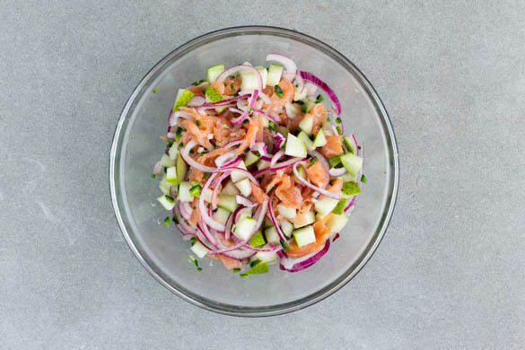 Die Chilischote halbieren und fein würfeln, dabei die Kerne entfernen. Die Birnen vierteln und in ca. 1cm große Würfel schneiden, dabei das Kerngehäuse entfernen. Die Zwiebeln in ein Sieb abgießen. Die Limetten halbieren und auspressen, den Limettensaft mit dem Räucherlachs, den Birnen, den Zwiebeln, der Chilischote und 1TL Salz vermengen.