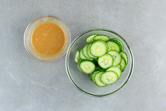 Die Sojasauce mit 6EL Mayonnaise und 2EL Honig zu einer Sauce verrühren. Die Gurke in dünne Scheiben schneiden und mit 1EL Essig sowie je 1 Prise Salz und Zucker vermengen.