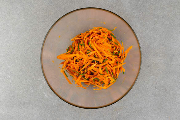 Ca. 1TL Ingwer schälen, fein reiben und mit 2TL Pflanzenöl, 1EL Essig, ½TL Zucker und 1 Prise Salz verrühren. Die Karotte ggf. schälen und grob raspeln. Den Schnittlauch in ca. 1cm breite Röllchen schneiden. Die Karotten mit dem Schnittlauch und dem Dressing zu einem Salat vermengen und mit Pfeffer abschmecken.