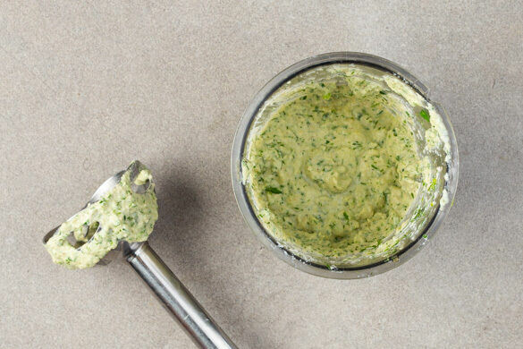Den Dill und die Petersilie grob schneiden und mit den Cashews, den Schalotten und dem Knoblauch samt Öl sowie dem restlichen Zitronensaft in einem hohen Gefäß mit einem Stabmixer glatt pürieren. Ggf. etwas Wasser hinzufügen, falls die Sauce zu dickflüssig ist und mit Salz und Pfeffer abschmecken.