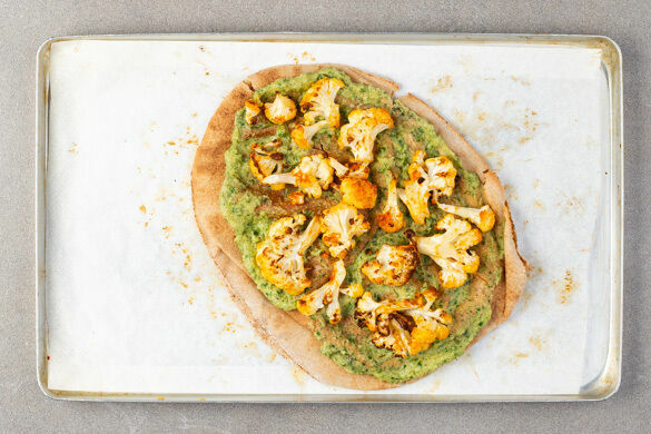 Die Pitabrote mit der ½ der Sauce bestreichen und mit dem Blumenkohl belegen, dann auf einem Backblech im unteren Teil des Ofens in 5–7Min. knusprig backen.
