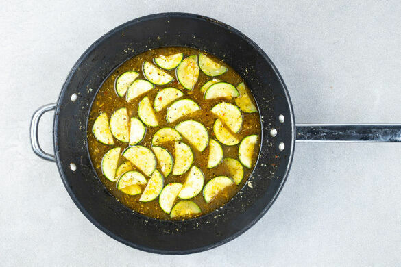 Die Zucchini, den Knoblauch und die Gewürzmischung in einer großen Pfanne mit 2EL Olivenöl und 1 kräftigen Prise Salz bei mittlerer Hitze ca. 3Min. anbraten. Mit 300ml heißem Wasser ablöschen, das Brühgewürz unterrühren und die Zucchini noch ca. 8Min. garen, bis sie weich ist. Die Pfanne vom Herd nehmen.