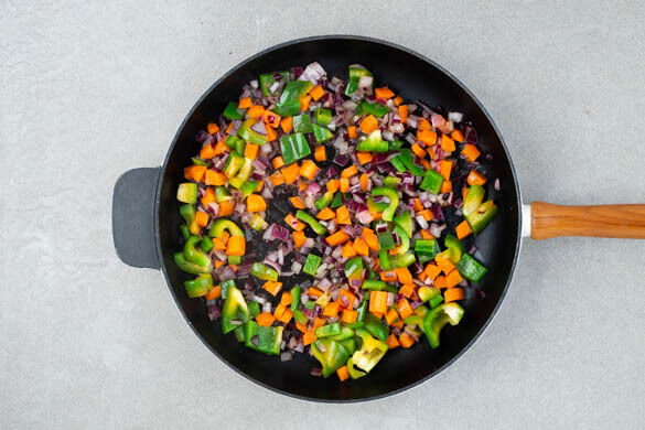 Das Gemüse in einer großen Pfanne mit 1EL Olivenöl bei mittlerer bis starker Hitze 8–10Min. anbraten. Mit je 1 kräftigen Prise Salz und Pfeffer sowie 1 Prise Zucker würzen.