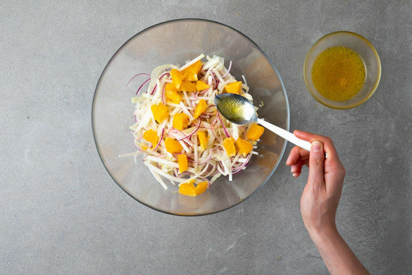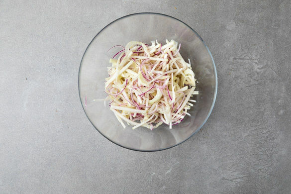 Den Kohlrabi schälen, halbieren und erst in dünne Scheiben, dann in schmale Streifen schneiden. Den Fenchel ebenfalls in dünne Streifen schneiden, dabei das Fenchelgrün für die Garnitur beiseitelegen. Die Zwiebel schälen, halbieren und in feine Streifen schneiden. Die Zitrone halbieren und auspressen. Das Gemüse und den Zitronensaft in einer Schüssel vermengen.