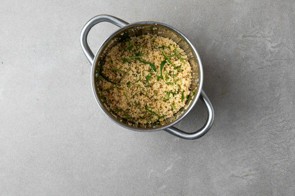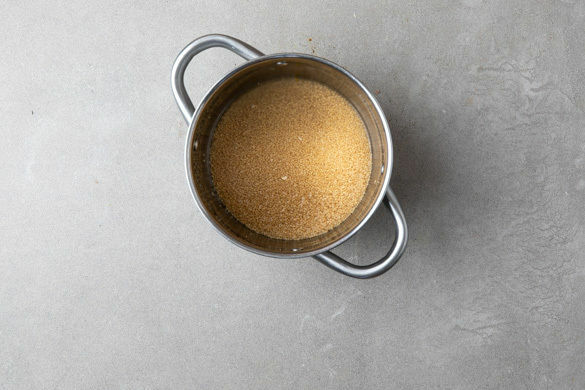 In einem mittelgroßen Topf 600ml leicht gesalzenes Wasser zum Kochen bringen. Den Topf vom Herd nehmen, den Couscous in das kochende Wasser rühren und abgedeckt 6–8Min. quellen lassen. Den Couscous mit einer Gabel auflockern.