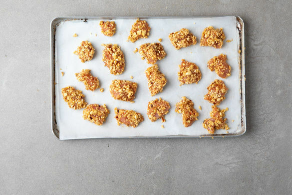 Den Backofen auf 220°C (200°C Umluft) vorheizen. Das Fleisch trocken tupfen, in ca. 3cm große Stücke schneiden und mit 2EL Olivenöl, der Gewürzmischung, 2EL Honig sowie je 1 kräftigen Prise Salz und Pfeffer vermengen. Die Cashews fein hacken, die Hähnchenstücke damit ummanteln und die Nuggets auf einem mit Backpapier ausgelegten Backblech 12–15Min. im Ofen knusprig backen.