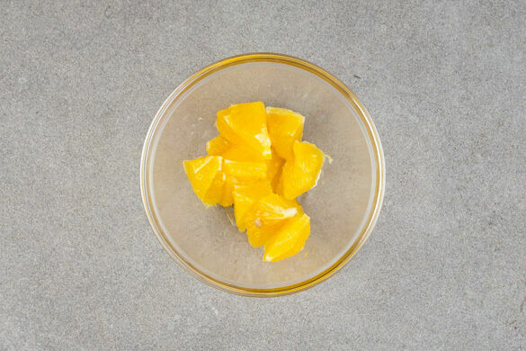 Die übrige Orangenhälfte schälen und das Fruchtfleisch grob würfeln.