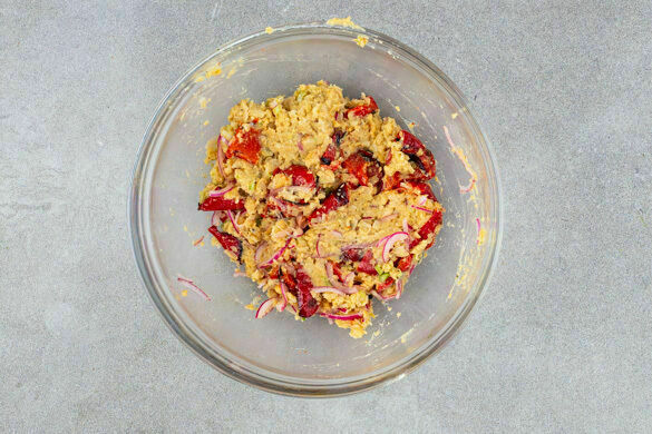 Die Paprika grob schneiden und mit ca. ⅔ der eingelegten Zwiebeln unter den Kichererbsenaufstrich mengen. Die Brötchen mit dem Aufstrich bestreichen und nach Belieben mit dem Salat und den restlichen eingelegten Zwiebeln belegen. Mit den aufbewahrten Kichererbsen garnieren und mit dem übrigen Kohlrabisalat servieren.