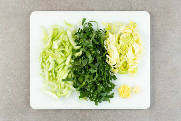 In einem mittelgroßen Topf 600ml leicht gesalzenes Wasser zum Kochen bringen. Den weißen und den grünen Teil des Pak Choi separat in ca. 1cm breite Streifen schneiden. Den Lauch längs halbieren, dann in ca. 0,5cm breite Streifen schneiden.